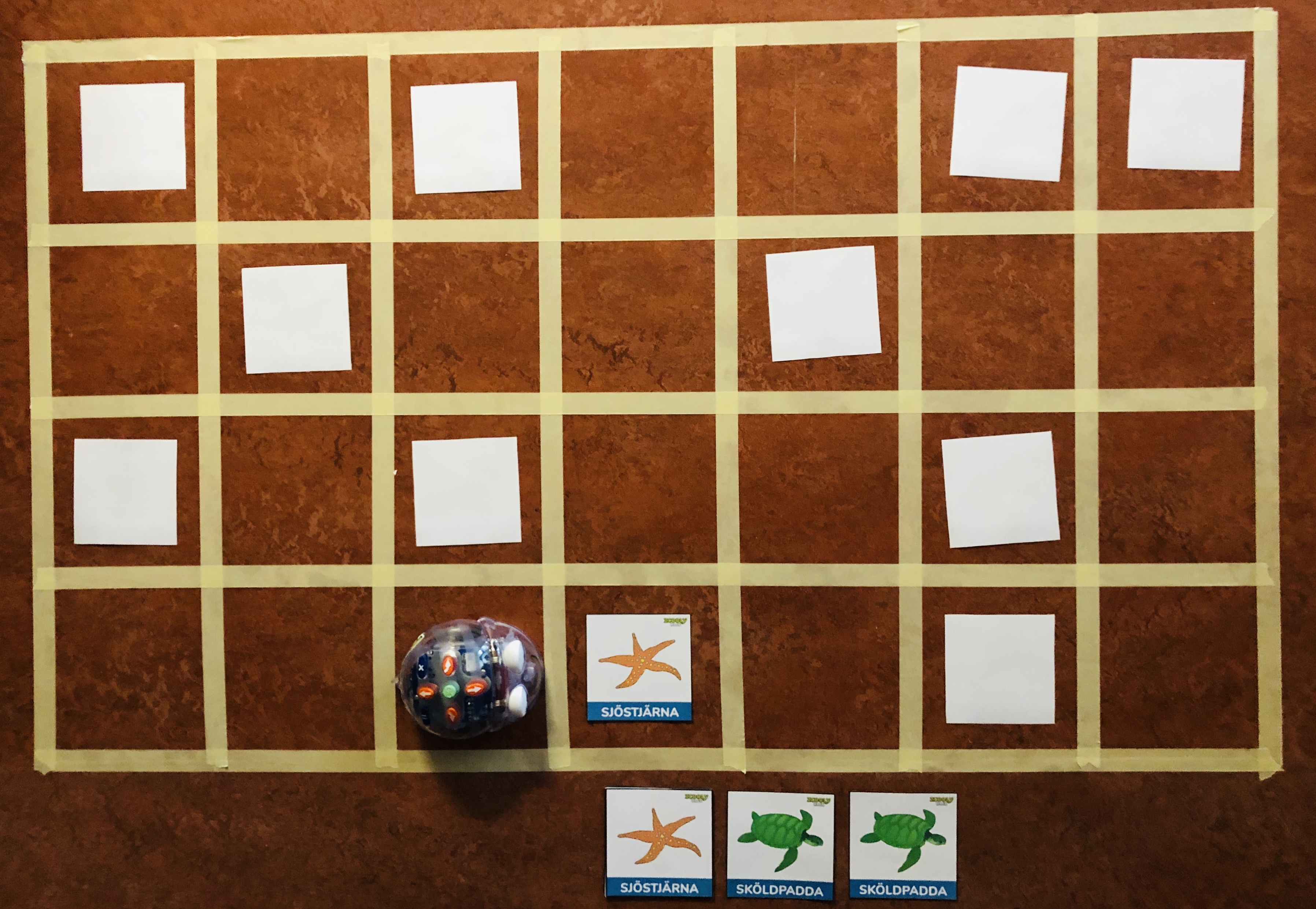 Börja med att lägga ut alla djurkort på programmeringsmattan med baksidan upp.