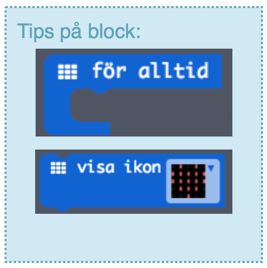 Titta först igenom kodverktyget på makecode.microbit.org, så att du kommer ihåg vilka olika ikoner som finns att välja på.